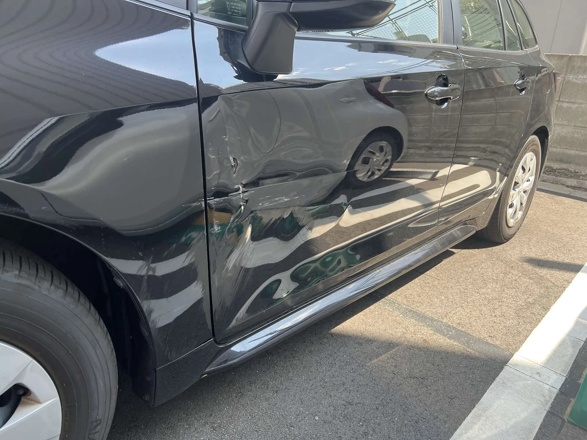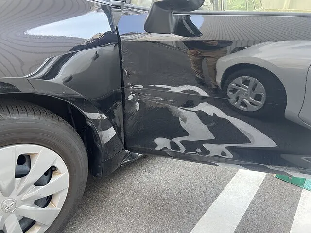 駐車場で接触されたとのことで、助手席側フロントドアからフェンダーにかけて大きなへこみと擦り傷が入ってしまっていました。